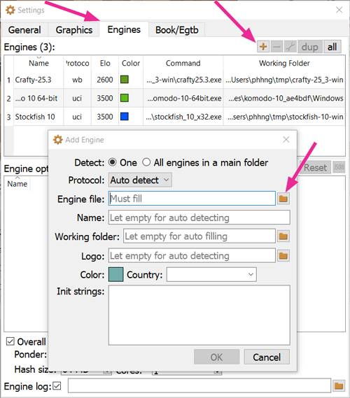a. Open Settings dialog (Windows, Linux: menu → File → Settings; macOS: menu → BanksiaGUI → Preferences), select the tab “Engines”, and then click “➕” button (on the top right corner) to open “Add Engine” dialog: