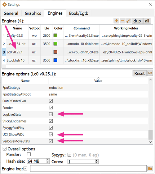 After an above method, Lc0 is ready to use. However, Lc0 can show some specific statistics which BanksiaGUI has supported thus they should be enabled to view.