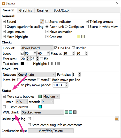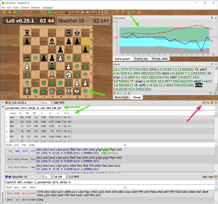 In the below illustration, Lc0 stats are shown in the multi-forms/places (marked by green arrows): a WDL chart (in “Score grapth” panel), bubbles (on the main board), simple string for WDL, stats tables, additional strings for PVs (in “Engine info” panel).