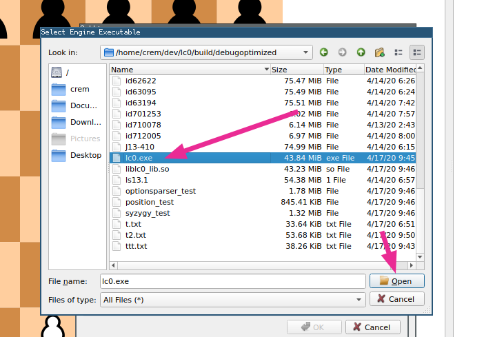 - In the “Select Engine Executable” dialog, find and select your lc0.exe file.